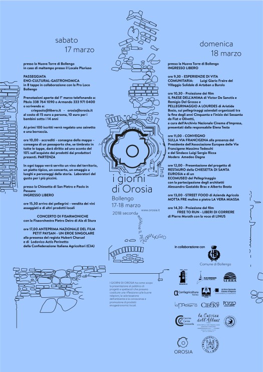 «I giorni di Orosia» si svolgono a Bollengo, sabato 17 e domenica 18 marzo, in una due giorni di cinema, degustazioni, incontri che promuovono la valorizzazione dell’ambiente, la conoscenza di prodotti enogastronomici locali, la riflessione sulle relazioni: due giornate di convegni, incontri, riflessioni sul territorio, sul cibo a km zero, sulla fotografia, sui libri, sulla conoscenza e valorizzazione della via Francigena, sul cinema d’impresa, nel profondo convincimento che i molteplici aspetti della cultura passino attraverso l’arte, il cibo, il vino, la letteratura, la filosofia, il cinema.