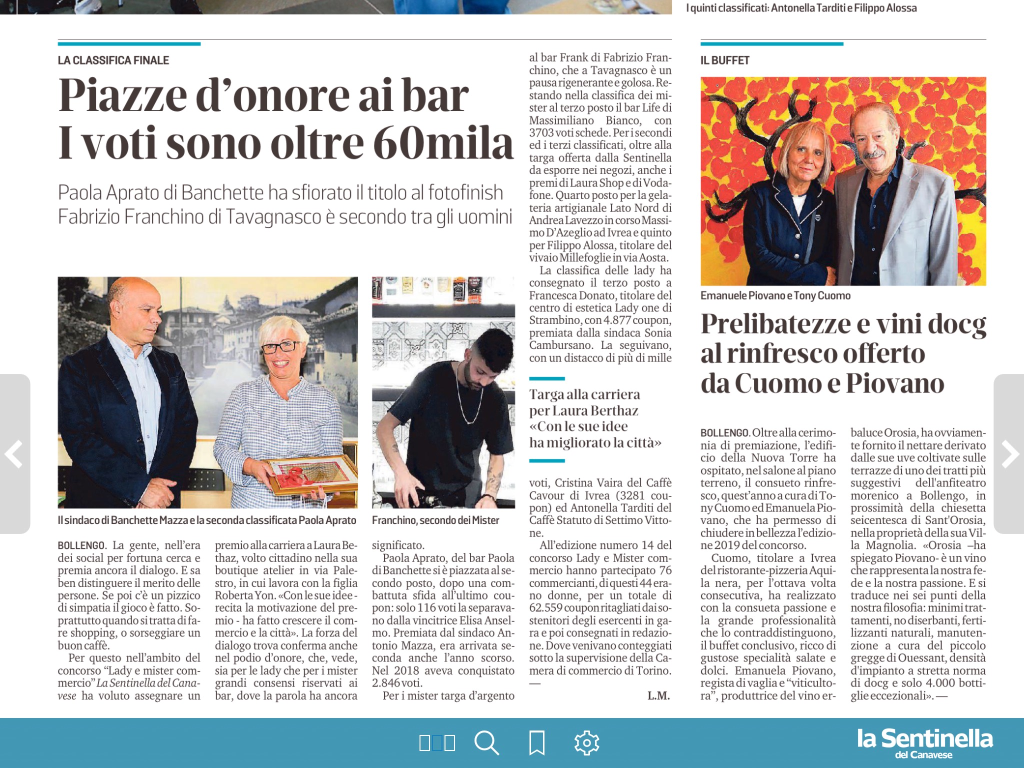 A presentare lo show man Daniele Lucca e il caporedattore Claudio Cuccurullo. Il rinfresco a cura per l’ottava volta Tony Cuomo, titolare ristorante-pizzeria Aquila Nera di Ivrea. Quest’anno ha partecipato anche Emanuela Piovano a fare da sponsor con il vino Erbaluce docg “Orosia” coltivato a Bollengo lungo la via Francigena.