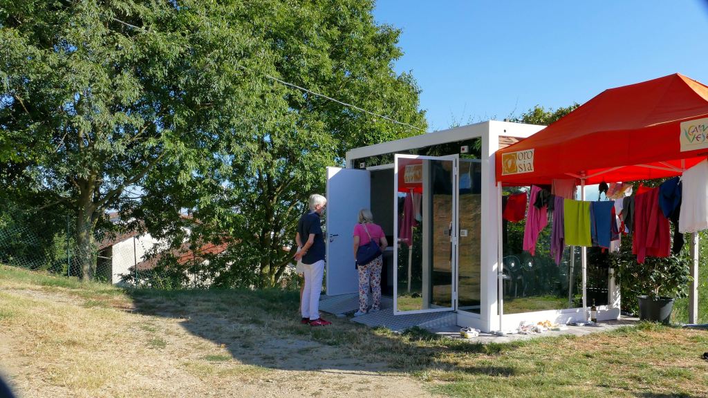 Per l’accoglienza il prato è stato allestito con tende, bagni innovativi prefabbricati per esterni e alcuni spazi ricreativi per la cucina di casa Magnolia.
