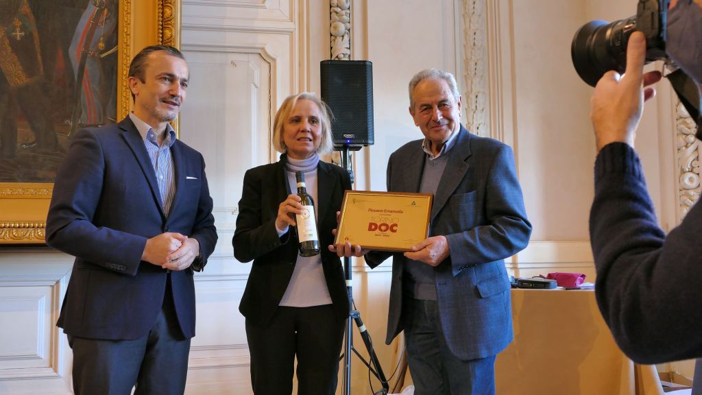 Emanuela Piovano, viticultora in Bollengo del vino biologico OROSIA che ha scelto una coltivazione, tutta ecosostenibile sulla via Francigena, riceve il PREMIO dal presidente della Camera di Commercio di Torino, dott. Dario Gallina, alla presenza di Sergio Arnoldi, Camera di Commercio di Torino, del presidente dell’Enoteca Regionale dei Vini della Provincia di Torino, Corrado Scapino e il giornalista Alessandro Felis.